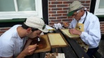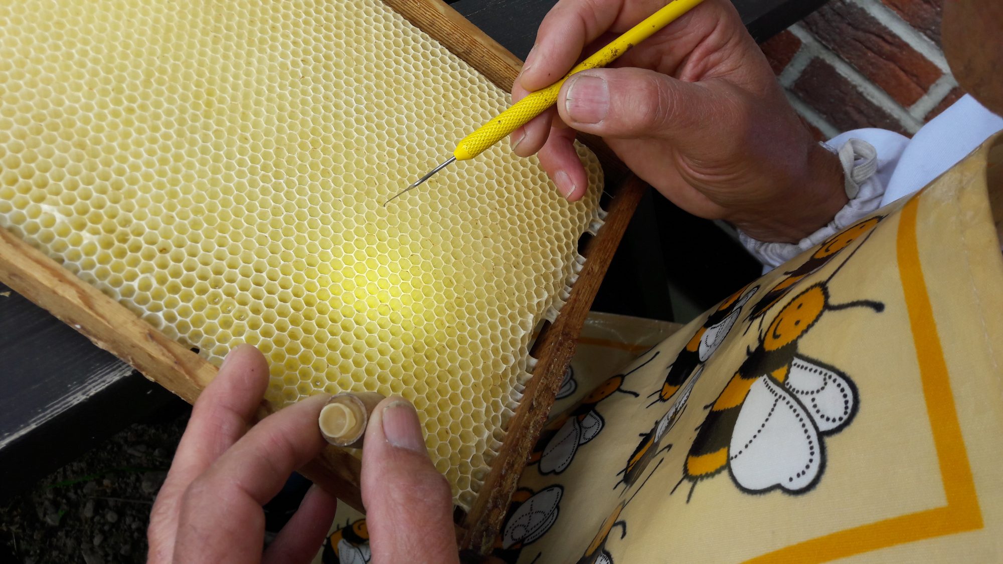 Ein gutes Auge und eine ruhige Hand sind von Nöten, um diese Arbeit zu machen, bei der die winzigen Larven mit sogenannten „Umlarvnadeln“ in Weiselbecher umgesetzt werden. Ein „Pflegevolk“ bekommt dann diese Weiselbecher eingesetzt und wird die Larven hoffentlich zu neuen Königinnen aufziehen.