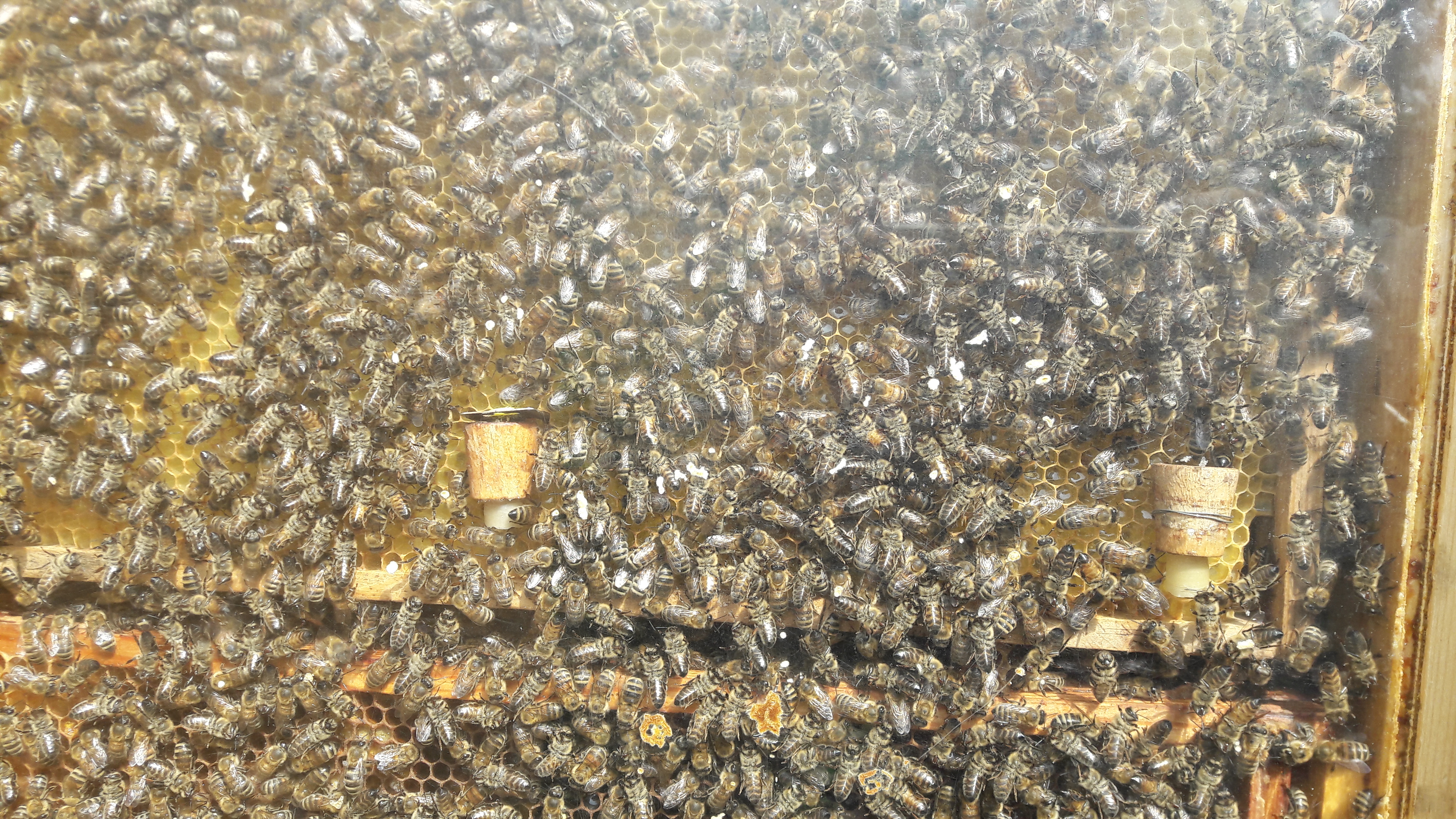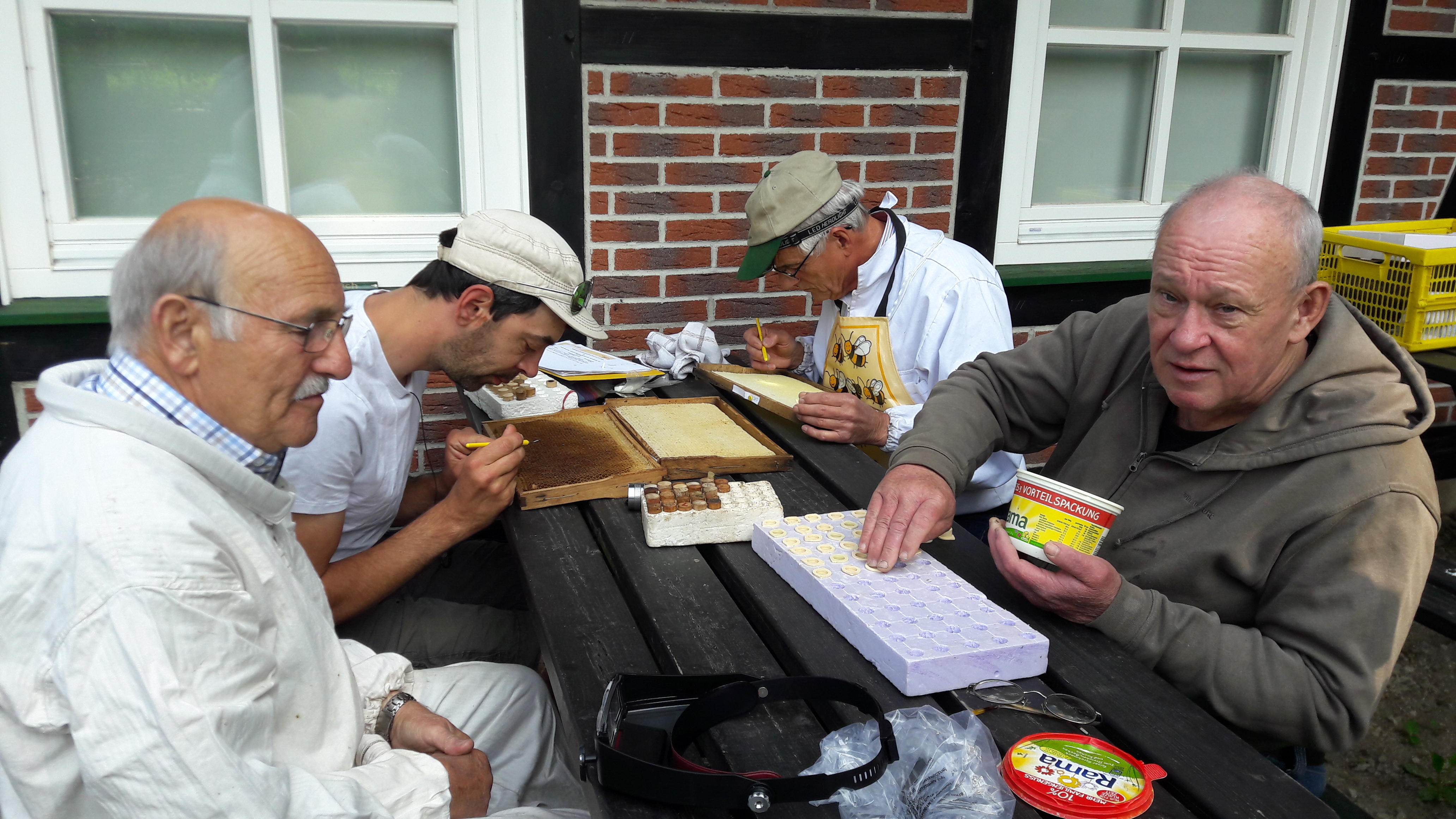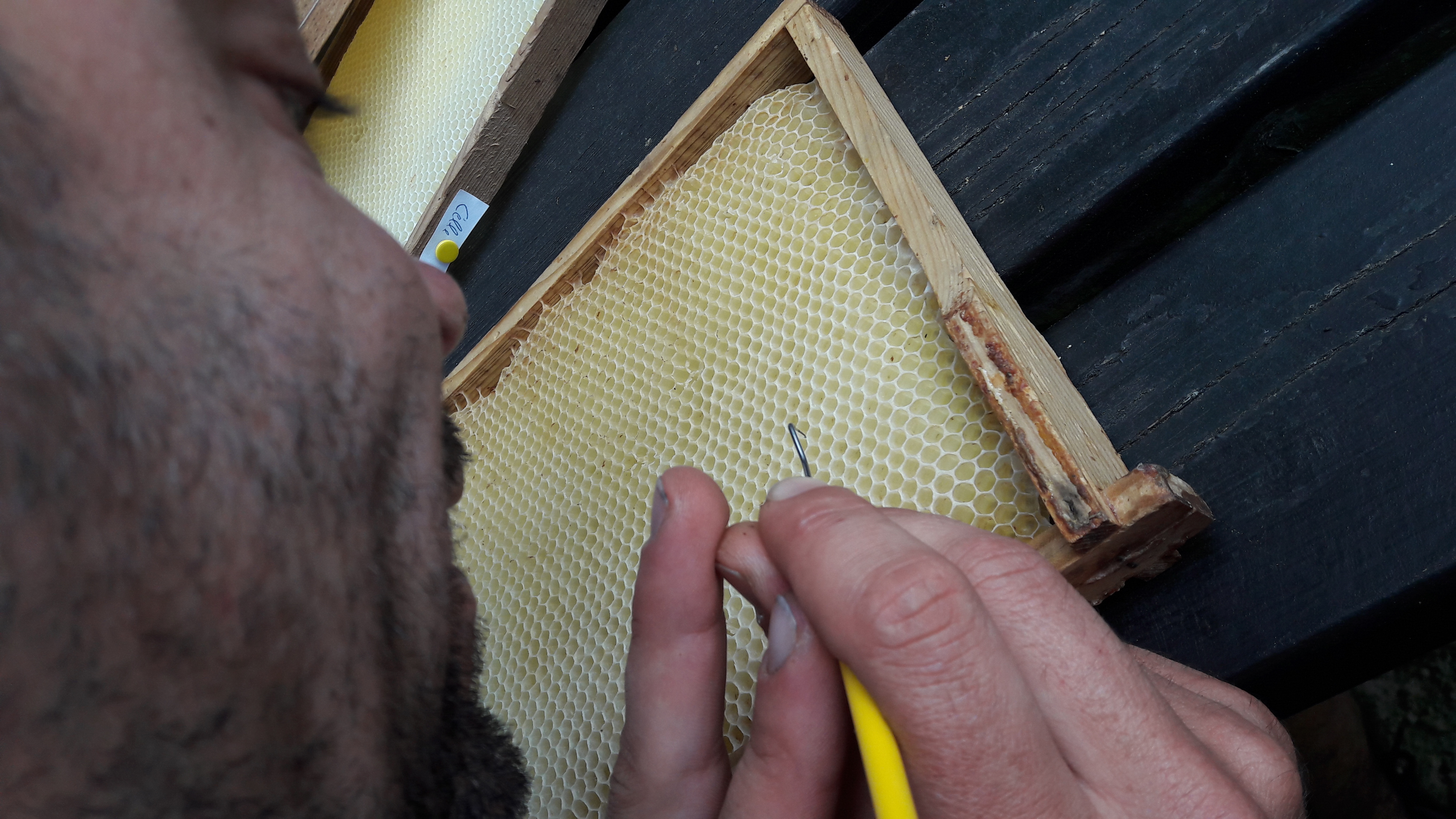 Ein gutes Auge und eine ruhige Hand sind von Nöten, um diese Arbeit zu machen, bei der die winzigen Larven mit sogenannten „Umlarvnadeln“ in Weiselbecher umgesetzt werden. Ein „Pflegevolk“ bekommt dann diese Weiselbecher eingesetzt und wird die Larven hoffentlich zu neuen Königinnen aufziehen.